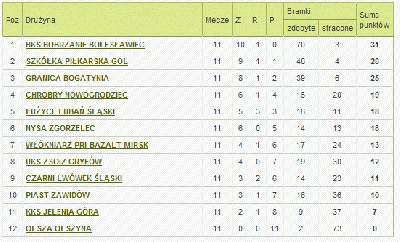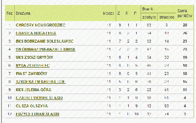 Młodzikom (tabela nr 2)wiodło się trochę gorzej, jednak do literującego Chojnika z Jeleniej Góry „Biało – niebiescy” mają dziewięć punktów straty, zajmując 7 pozycję w tabeli ligowej. Młodzicy w jedenastu spotkaniach zdołali 5 razy wygrać, cztery razy przegrać i dwa razy zremisować. Bilans bramkowy naszych młodych piłkarzy przedstawia się bardzo skromnie. Podopieczni trenera Matusewicza zdołali strzelić 14 bramek, tracąc jednocześnie 15 goli.