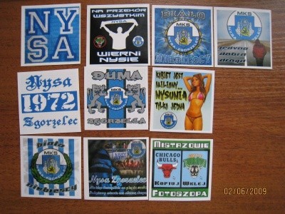Zapraszamy wszystkich do zakupu najnowszej 6 edycji vlepek MKS Nysy Zgorzelec. Wszystkich zainteresowanych prosimy o kontakt z administratorami lub pod numer gg 4066539. Koszty wynosi 6 złoty 100 sztuk, pakowanych 10 wzorów po 10 sztuk. Zachecamy do zakupu!